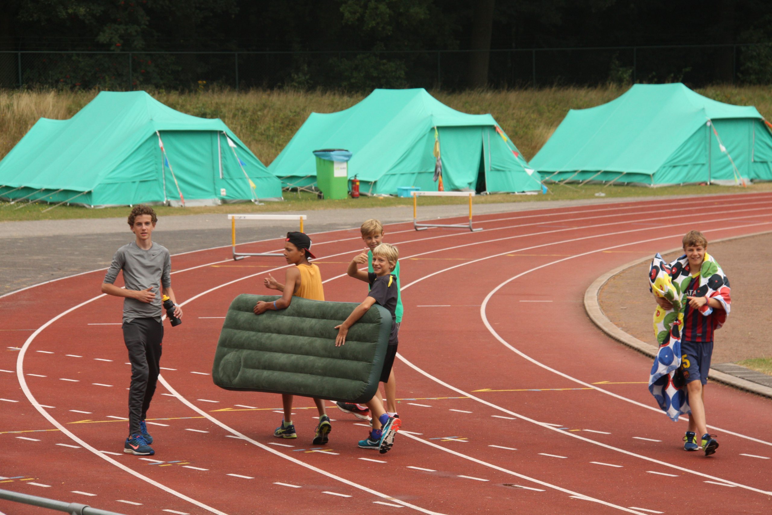 Gedurende het zomerkamp slaap je met ongeveer 8 personen in een ruime tent aan de rand van de atletiekbaan. De tenten worden vooraf door de organisatie opgezet. Elke leeftijdsgroep heeft een eigen tentdorp en de jongens en meisjes slapen gescheiden. Bij je inschrijving kun je aangeven of je bij vrienden/vriendinnen, trainingsmaatjes of familie in de tent wilt liggen. Dit kan alleen als je in dezelfde leeftijdscategorie valt.